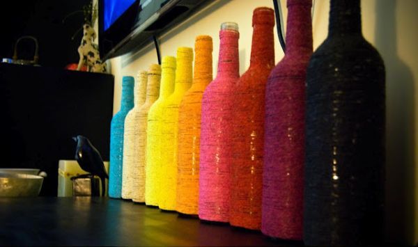 Подберете различни цветове прежда или конци и увийте бутилките в тях. Ако ги аранжирате на плота в кухнята, ще получите прекрасна цветна украса с много настроение.